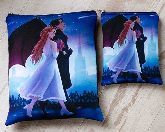 Funda literaria con cierre de cremallera, por un lado con una ilustración exclusiva y por el otro con polipiel negra, relleno acolchado en la cara delantera y forro interior con estampado vichi.