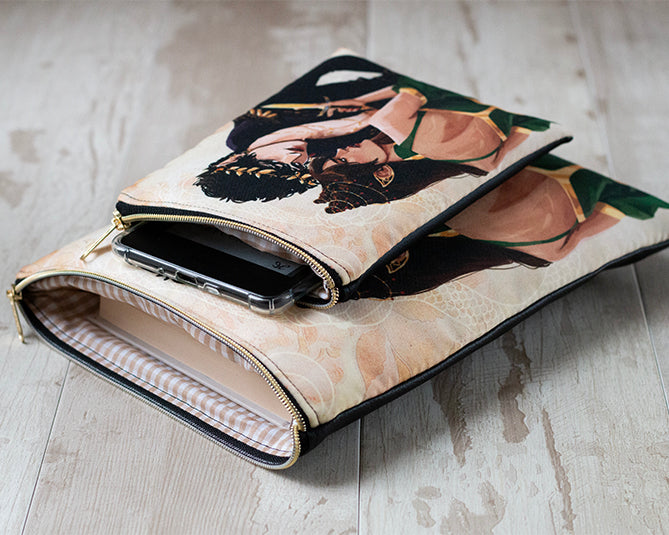 Funda literaria con cierre de cremallera, por un lado con una ilustración exclusiva y por el otro con polipiel negra, relleno acolchado en la cara delantera y forro interior con estampado vichi.