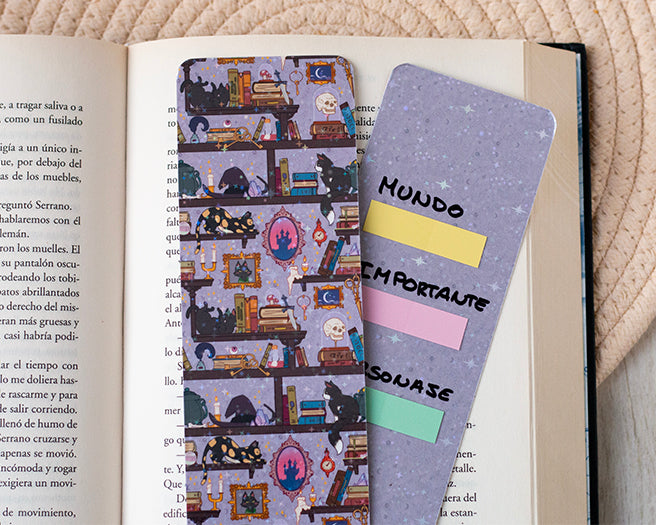 Marcapáginas impreso en papel de alta calidad y plastificado holográfico en ambas caras, lo que lo hace muy resistente y además puedes usarlo para llevar tus postit y escribir sobre él.
